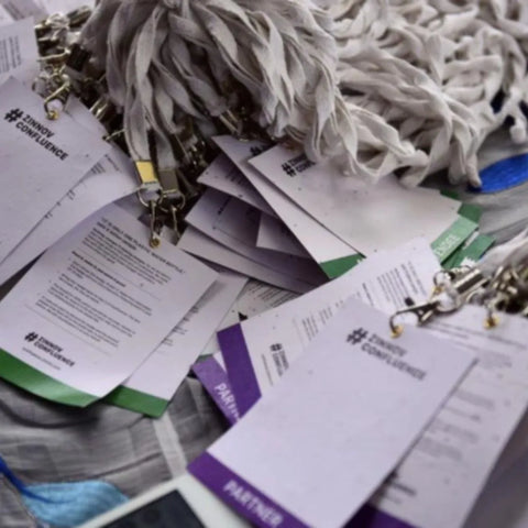 6. Single use plastic conference name tags and plastic branded lanyards are super wasteful: Consider printing name tags kraft paper, FSC (Forest Stewardship Council®) certified paper or seed paper and use reusable cotton non-customized lanyards for every event; have a drop off box when conference attendees are leaving the venue they can drop it off and you can reuse them for your next event or conference. Loved these seed name tags from the Zinnov Confluence Zinnov Events